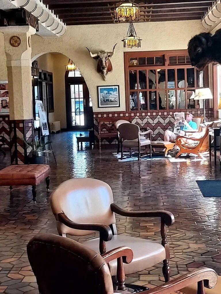 The hotel, now fully restored and wit a rich history of its own, is surrounded by tall cedar trees and is designed in the old west style with an outdoor fountain and patio, a large living room with a big stone fireplace, large comfortable sofas and mounted animal heads on the walls.